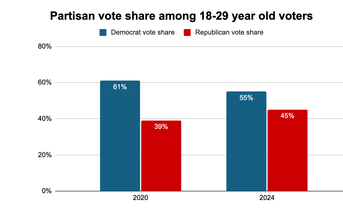 Below is the chart that’s been making the rounds showing a 6-point swing to the right among young voters. It is incomplete at best and misleading at worst. By focusing on “vote share,” it sidesteps the non-voters entirely. So, great for hot takes. Useless for actual planning.
